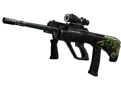 Powerful and accurate, the AUG scoped assault rifle compensates for its long reload times with low spread and a high rate of fire. It has been custom painted with the image of a chameleon.
