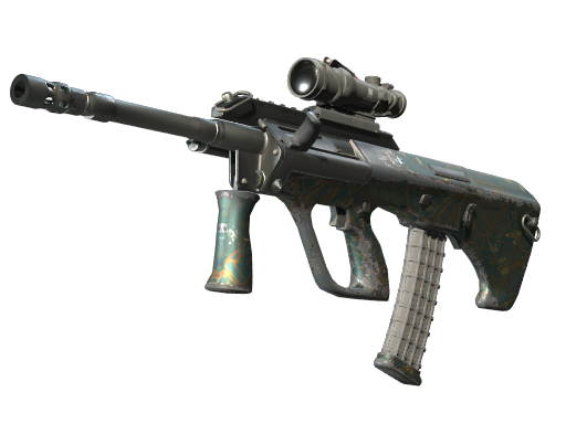 Powerful and accurate, the AUG scoped assault rifle compensates for its long reload times with low spread and a high rate of fire. A custom paint job of a map pattern overlayed with a bird’s eye HUD has been applied.