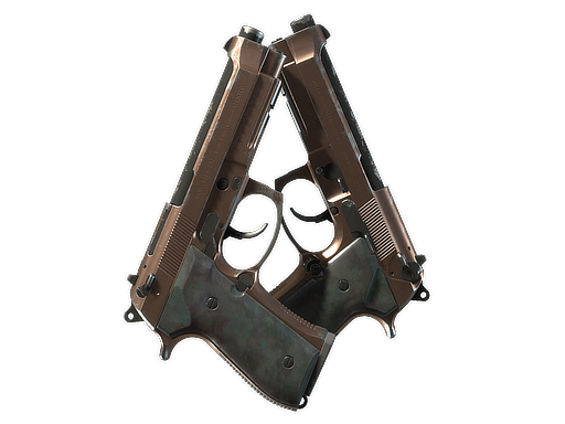 Firing two large-mag Berettas at once will lower accuracy and increase load times. On the bright side, you’ll get to fire two large-mag Berettas at once. The metal of these Dual Berettas has been painted rose gold and the grips are a nacred, deep jade color.