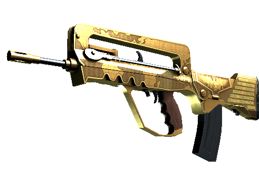 A cheap option for cash-strapped players, the FAMAS effectively fills the niche between more expensive rifles and the less-effective SMGs. It has been custom painted gold and features various details celebrating 20 years of Counter-Strike.