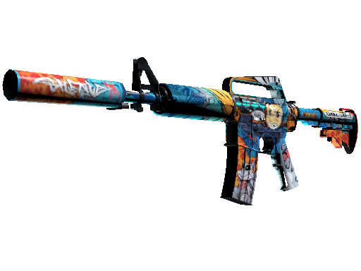 With a smaller magazine than its unmuffled counterpart, the silenced M4A1 provides quieter shots with less recoil and better accuracy. It has been custom painted with bright colors and features animated versions of a GIGN CT and Pop Dog.