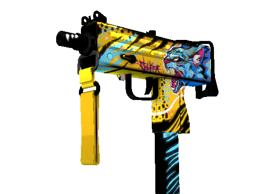 Essentially a box that bullets come out of, the MAC-10 SMG boasts a high rate of fire, with poor spread accuracy and high recoil as trade-offs. It has been custom painted with a neon blue cat and yellow and black stripes.